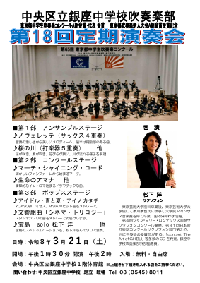 吹奏楽部 3月21日(土)に定期演奏会開催 是非ご来場ください。 2026/03/06 吹奏楽部 3月21日(土)定期演奏会を開催 吹奏楽部は3月21日(土)に、第18回定期演奏会を以下のように開... 1組 江ノ島校外学習 2026/02/27 1組 江ノ島校外学習 本日、1組は江ノ島に校外学習に行きました。 午前中に新江ノ島水族館でイルカショーを楽... 【第2学年】職場体験学習実施のご報告と御礼 2026/02/09 本校第2学年では、1月28日(水)から30日(金)までの3日間、地域の各事業所のご協力をいただき、職場体験学習...