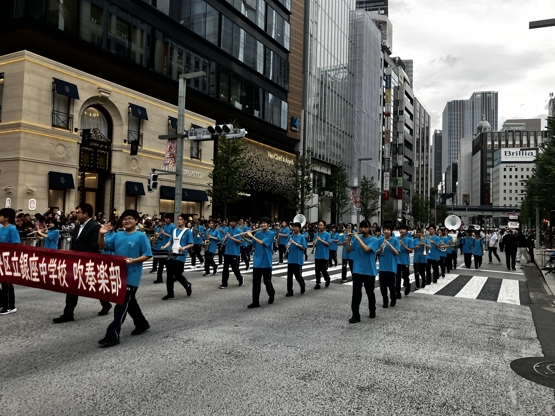 吹奏楽部は、10月19日(日)AMに「秋の交通安全 銀座ゴールデンパレード」に出場しました。銀座中学校吹奏楽部としては、初めてのパレードの参加でした。マーチング用の打楽器やスーザフォンを活用しながら、銀座中央通りを堂々と演奏しながら歩くことができました。ほぼ1・2年生での演奏だったので、とても良い経験となりました。